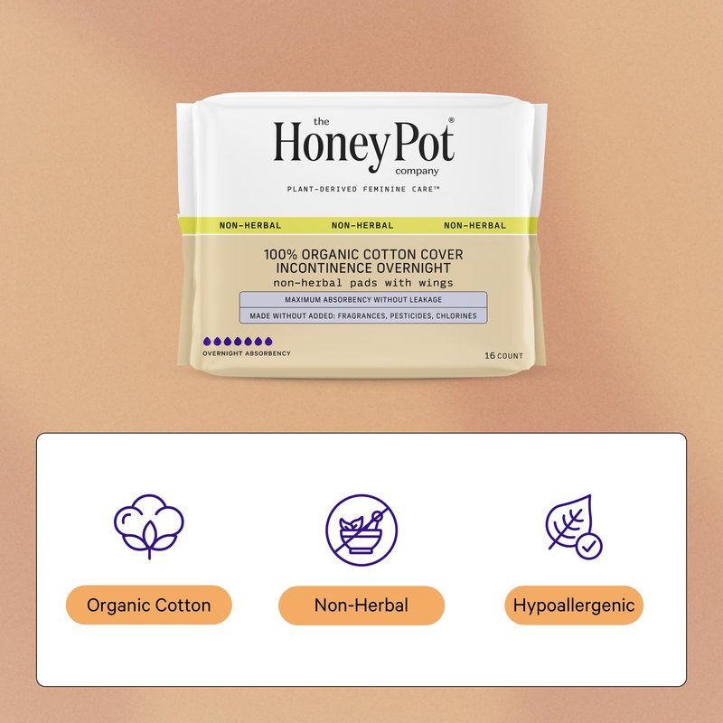 The Honey Pot Company – Incontinence Pads for Women - Non-Herbal Overnight - Bladder Leak Control - Organic Cotton Cover & Ultra-Absorbent Pulp Core - Incontinence Pads - FSA & HSA Eligible – 16 ct.