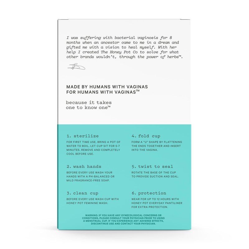If tampons or pads aren't your "cup" of tea, reach for the Honey Pot Co Menstrual Cup: a convenient, sustainable alternative that's good for you and the earth. The feminine menstrual cup is made with medical-grade silicone and is free from latex and phthalates. Our silicone menstrual cup can be reused over and over again! Our feminine cup comes in two sizes: Size 1 is ideal for those with a light-to-medium flow while Size 2 is ideal for those with a medium-to-heavy flow. A message from our founder Bea Dixon -- I was suffering with BV when an ancestor came to me in a dream and gifted me with a vision to heal myself. With her help I created The Honey Pot - feminine care powered by herbs that is backed by science, clinically tested and gynecologist-approved. Made by humans with vaginas, for humans with vaginas. Because it takes one to know one.