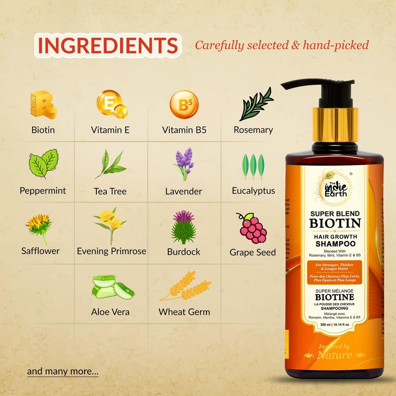 - The Indie Earth Biotin Hair Growth Shampoo contains the goodness of Volumizing Biotin, Rosemary, Mint, Tea Tree, Lavender, Evening Primrose, Grapeseed, Aloe Vera, Vitamin E and B5 for long, healthy, silky and shiny hairs.