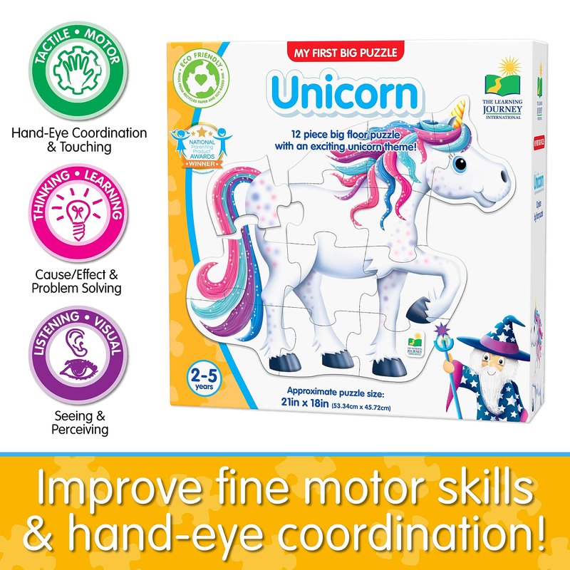 - KEY FEATURES – With the My First Big Floor Puzzle – Unicorn - your child will be fascinated as they piece together their magical unicorn friend! Your little one will learn as they build from piece to piece, sparking interest and improving concentration skills. The beautifully illustrated My First Big Floor Puzzles will keep your child engaged and is the perfect activity with play mates, too. The puzzle is made up of 12 large shaped puzzle pieces and is an excellent way to develop tactile and problem-solving skills. Puzzle pieces are bright and colorful, and encourage discussion.