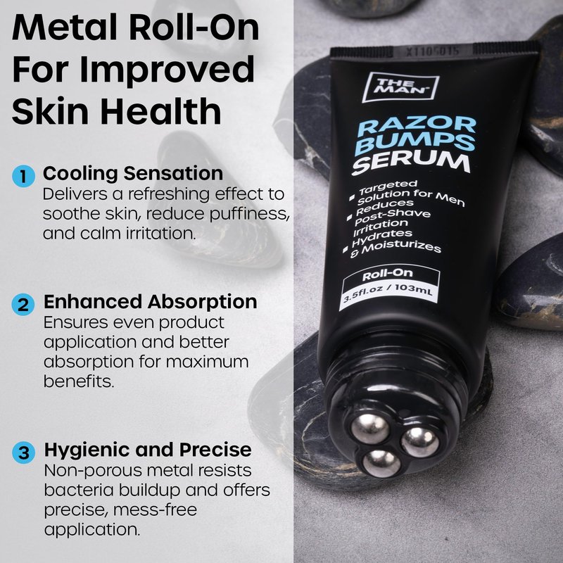 Experience the ultimate solution for smooth, bump-free skin with The Man's Razor Bumps Serum—crafted for men who demand the best in grooming. Engineered with a unique metal roll-on applicator, this advanced formula offers precise, soothing application to eliminate razor bumps and ingrown hairs while promoting long-term skin health. Proudly made in the USA and OTC registered, it’s a trusted companion for a refined shaving experience. Specifically designed to meet the unique grooming needs of men, this serum works without irritation, making it ideal for all skin types, including black men seeking an effective razor bump treatment or anyone desiring a smooth bald shave. It tackles stubborn ingrown hairs and razor burns effortlessly, leaving your skin clear, calm, and razor-burn-free. Add it to your daily shaving routine and say goodbye to discomfort, irritation, and uneven skin. More than just an aftershave, The Man Razor Bumps Serum is infused with skin-loving ingredients to enhance overall skin quality, elevating your grooming game to new heights. Its portable design makes it perfect for home use or travel, ensuring your skin stays smooth and ready for any occasion. The metal roll-on applicator enhances the experience with a cooling sensation that soothes the skin, reduces puffiness, and boosts circulation for a healthier complexion. Transform your shaving ritual with The Man Razor Bumps Serum—the trusted, top-rated solution for razor bumps, ingrown hairs, and razor burn. Embrace flawless skin and the confidence that comes with it. The future of grooming is here.