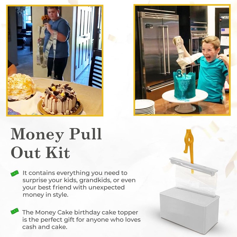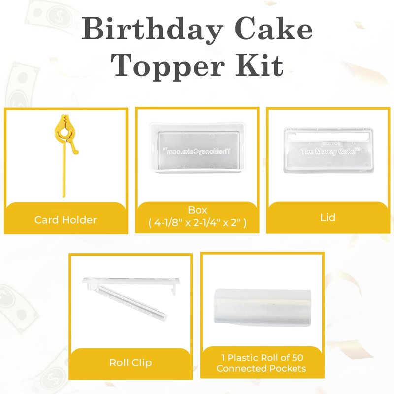 The Money Cake - Money Cake Pull Out Kit Includes 1 Money Box 1 Plastic Roll 50 Transparent Bag Connected Pocket, and Card Holder Cake Topper for Birthday and Graduation Parties