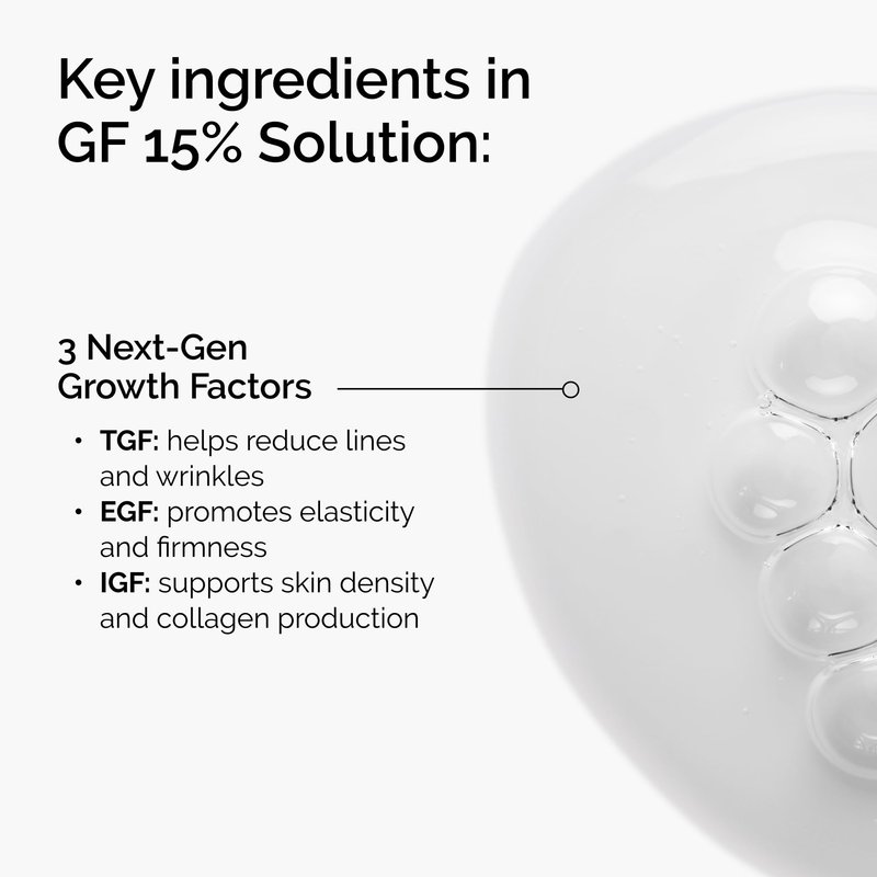 - GROWTH FACTORS SERUM: GF 15% Solution helps minimize and repair visible skin damage to regenerate the appearance of aging skin across the face and neck.