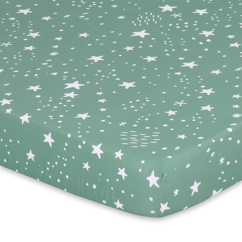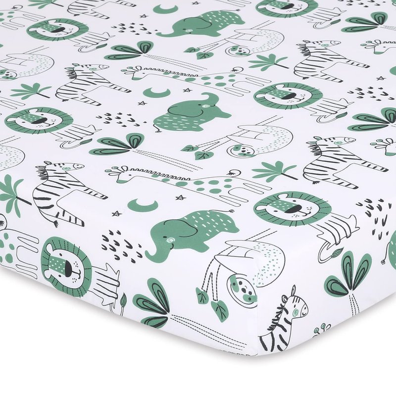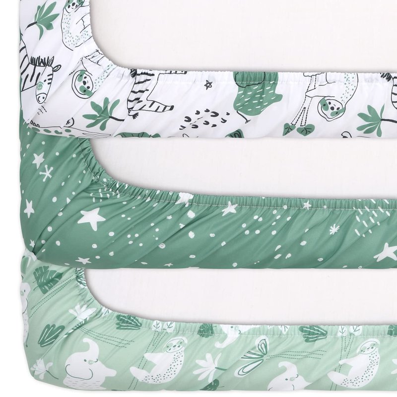 The darling Green Safari fitted mini crib sheet set from The Peanutshell includes 3 unique jungle themed allover prints in shades of green and white. A cute character tossed with giraffe, elephant, lion, zebra, and palm trees; tossed stars; and a botanical elephant & sloth pattern make up this well-curated trio. The all-around elastic design ensures a safe and snug fit that's compatible with most standard mini crib, pack and play, playard, play pen, and portable crib mattresses. The fade-resistant material is quick-drying and machine washable, providing excellent quality and easy care at a great value.