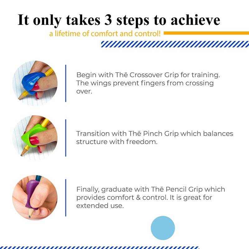 - Pencil Training Kit: This package includes three premium pencil grips; The Crossover Grip, The Pinch Grip and The Pencil Grip; Follow the training process with these ergonomic pencil grips to achieve a lifetime of control and comfort