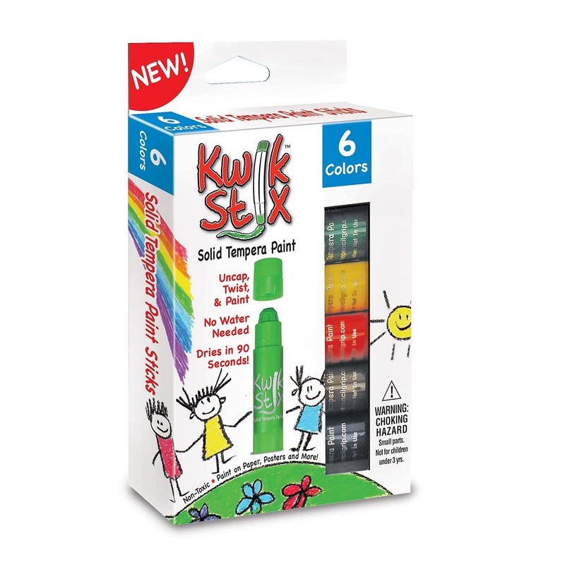 Tired of the endless mess of painting? Fear not! Kwik Stix Solid Tempera Paint sticks take the mess out of painting while keeping all the fun! Simply uncap, twist, and paint! Kwik Stix have a fast drying formula that allow them to dry in 90 seconds while still leaving a paint-like finish! No cups, smocks, water or brushes required. Kwik Stix come in assorted vibrant colors with coverage that won't crack. Great on poster paper, cardboard, wood and canvas. Pack of 6 assorted colors.