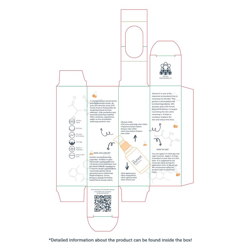 - Vitamin C is one of the important antioxidants that are necessary for the skin. This product is formulated with enriched ingredients; 10% Ascorbic Acid, 0.5% Ferulic Acid and Prebiotics. It targets nourishing the skin while renewing it. It helps to revitalize, brighten the skin and reduce fine lines. Made in Türkiye. 8682773091298