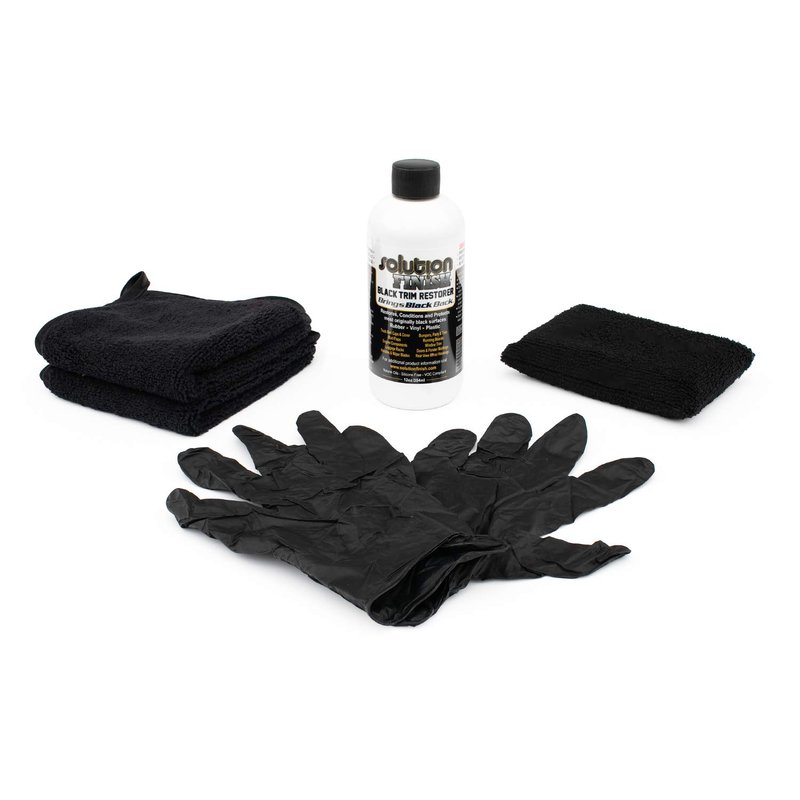 Solution Finish Black Trim Restorer restores black surfaces to a deep, rich finish, without any "wet look" or shine. This unique formula combines ancient ingredients with advanced polymer technology to provide a spectacular, long-lasting, black, protective finish. Use it to restore, condition, and protect bumpers, pads, trim, mirrors, mud flaps, window trim, seals, running boards, truck bed caps and covers, handles, wiper blades, etc. Another big plus with Solution Finish is that it is formulated for professional use, meaning it is a silicone-free solution that uses all natural oils and is VOC compliant. If you are looking for a great product to help restore faded trim, look no further then Solution Finish Black Trim Restorer.