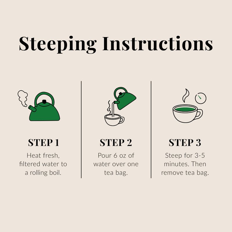 - STEEPING INSTRUCTIONS: Simply heat fresh, filtered water to a rolling boil. Then pour 6 oz of water over a tea bag and steep for 3-5 minutes. Remove the tea bag and enjoy Sip by Sip. Add a bit of honey or a splash of milk if desired. For iced tea, double the amount of tea bags and pour over a generous amount of ice. After steeping, add the used tea bags to compost or soil — they make gardens happy.