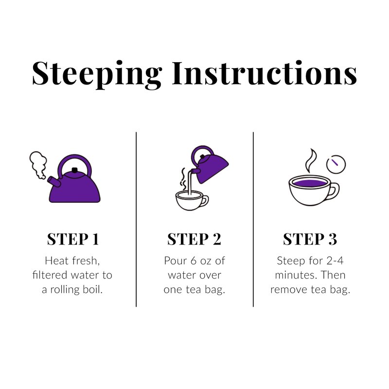 - STEEPING INSTRUCTIONS: Simply heat fresh, filtered water to a rolling boil. Then pour 6 oz of water over a tea bag and steep for 2-4 minutes. Experiment to find your favored steeping time. Remove the tea bag and enjoy. After steeping, add the used tea bags to compost or soil — they make gardens happy.