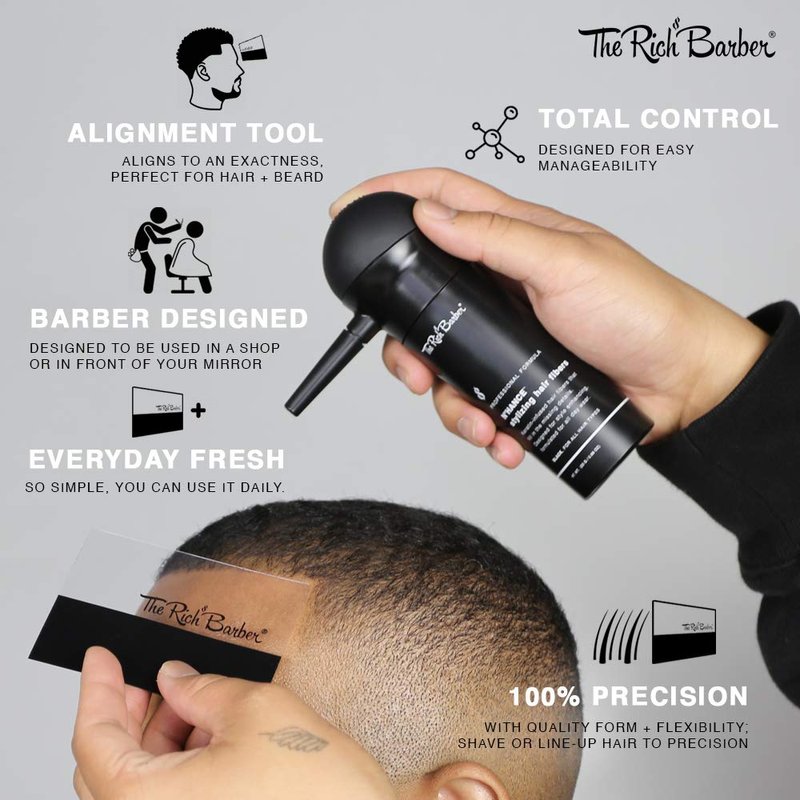 Stand apart from the rest by achieving professional detail and alignment on every cut, edge, and beard line up. The Rich Barber Hair Fiber Applicator and Hairline Enhancer Card makes professional style easy. Its clear design and flexibility provide the ultimate control, allowing you to achieve even the most complex styles. The easy clean feature allows you to reuse the applicator repeatedly.