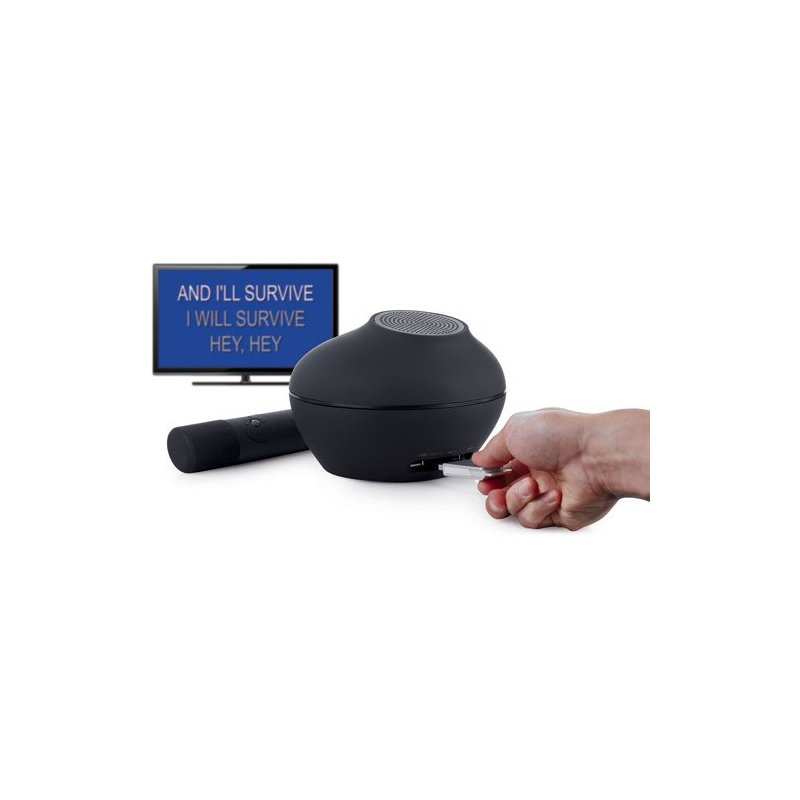 Keep the party going with The Singing Machine Karaoke Player, 4TV. The proprietary on-screen user-interface allows you to control all features on the 4TV. This innovative Karaoke CD Player offers cutting-edge features and unique design with great sound.The Singing Machine 4TV Karaoke Player:3 USB ports: 2 for USB microphones and 1 for contentUSB microphone is compatible with PC or MACSix buttons located on the Mic to remotely control all of your functionsUser interface available through your TV allows you to adjust karaoke settings and playlistKaraoke CD Player plays CD+graphics, music CDs, MP3s and introducing MP3+graphicsFirst household karaoke machine to support MP3+G digital karaoke mediaSMC USB microphone included How to Use the Karaoke CD Player: The Singing Machine 4TV connects to your home television through RCA Cables (included). Connect RCA cables and power cord to unit and connect appropriately to TV and power source. From there you can swivel-open the Singing Machine 4TV top to find a CD+G player for your favorite karaoke CD or insert your flash-drive into its designated USB port. The flash-drive is to be used to play your downloaded MP3+G songs, you can download these from our online store, where there are 1000s of song choices. The Singing Machine 4TV microphone controls the on-screen user interface and features. Using the menu button, and up/down, left/right pad you can choose whether you want to use CD+G mode, USB mode or control features from the main menu. In USB mode you can see your playlist and choose songs in any order. On the features list you can control how high your mic volume is, your echo, balance and Auto Voice Control. (**Helpful Hint: Hold the middle button down for a couple of seconds during a song to be re-directed back to the main menu.)