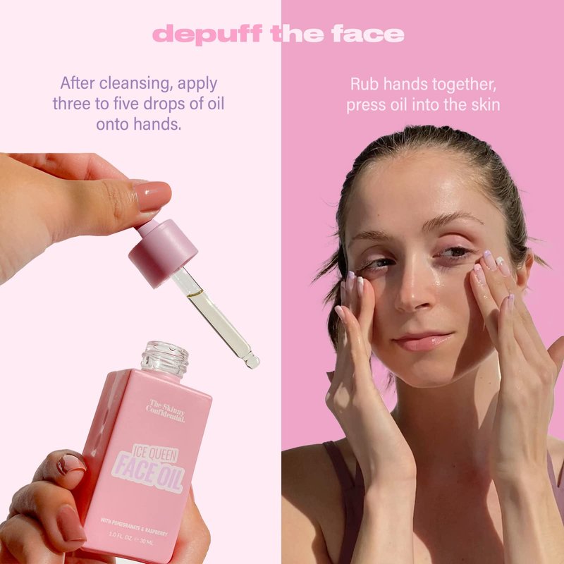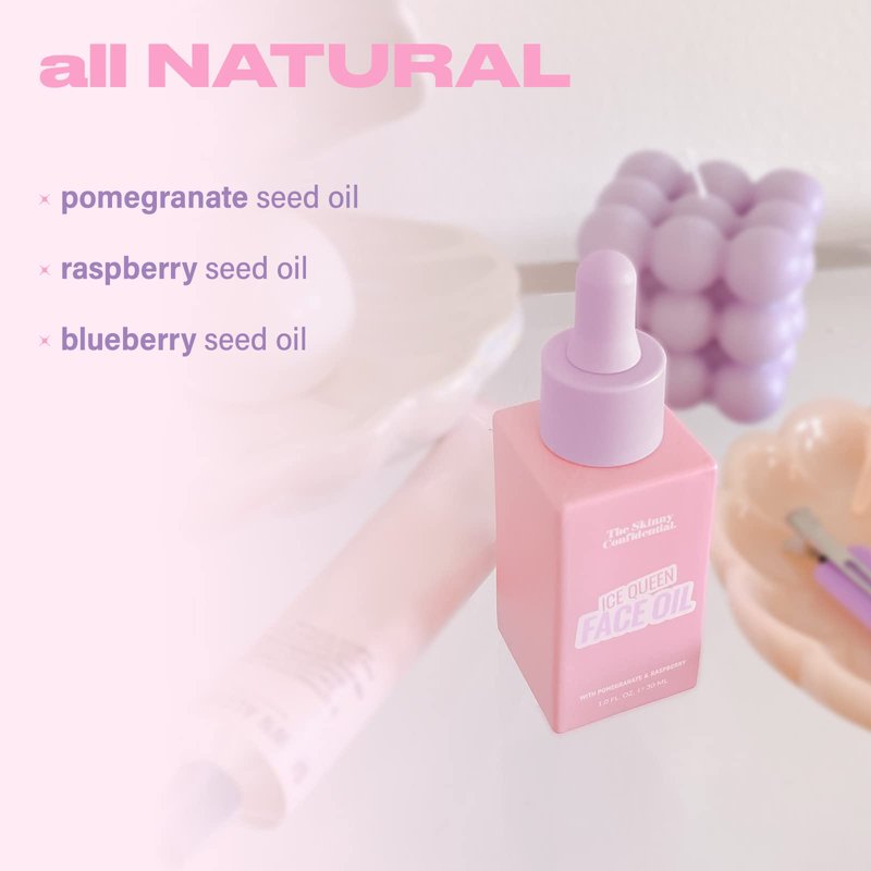 ICE QUEEN face oil makes every skin type glow and can be easily added to any skincare or beauty routine. It’s vegan, cruelty free, gluten free, synthetic fragrance free, made with only high-quality ingredients like pomegranate, raspberry & blueberry seed oil, with vitamins C & A. It helps reduce the appearance of fine lines and wrinkles, repairs and protects the skin’s moisture barrier, leaving it soft and supple. After cleansing, apply 3-5 drops of ICE QUEEN face oil into your hands and press onto your skin.