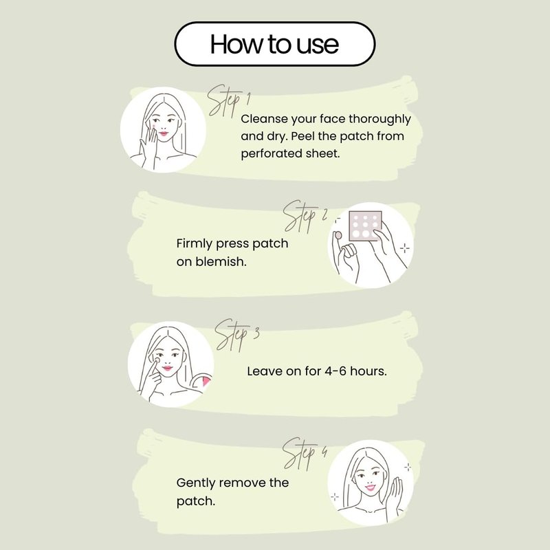- IMPROVE PIMPLES IN 4-6 HOURS – Our acne patches gently absorb impurities and aid in flattening pimples. Once finished, our pimple stickers peel off easily without causing redness or irritation. Suitable for both face and body. For acne patch application: Clean and dry the area, apply the patches, wait 4-6 hours, then gently remove. For best results, leave on overnight or during the day for 6+ hours.