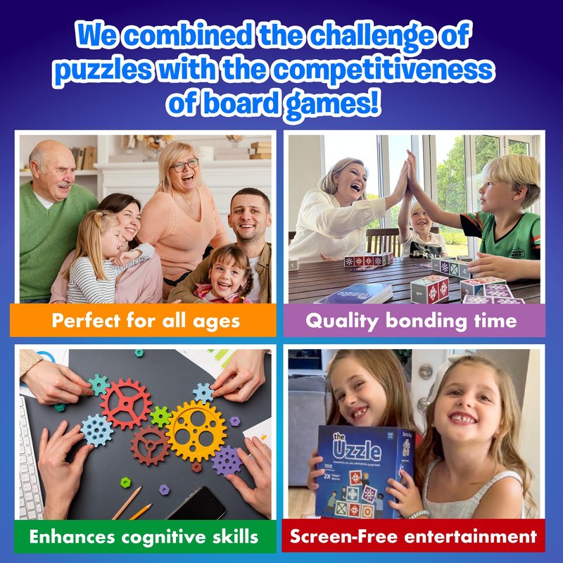 Compete With Family & Friends To See Who Will Be The Best The Uzzle 2.0 family games is our most competitive and challenging game yet! If you're skimming for a game to play once and leave out collecting dust for years - then you have come to the wrong place. But if you're here because you feel that your kids deserve better. That they deserve to have real-life experiences that bring genuine joy. Then welcome home! How to play? It's a very interesting game in this player's race to organize a set of 5 blocks so that they match a pattern shown on a card. The first player to complete grabs the card and a new matching race start. Suspense rise as you shuffle to outpace and outplay your competitors in this innovative game. So fire up your neurons and be fascinated by The Uzzle! 4 difficulty levels: Levels 1-2 are great for young kids. Levels 3-4 are great for adults. 25 puzzles per level. Impossible to memorize. What makes us different? 100 new puzzles 2x bigger blocks 4 difficulty levels Parent-Child Games: This game allows you to expend more time with your kids. The Uzzle board game increases the ability of kids to think and memorize when parents help their children.