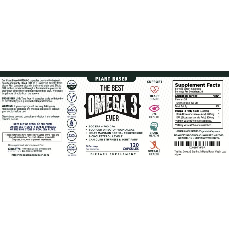 - ▶ BIOAVAILABLE DHA AND EPA ALGAE SUPPLEMENTS* - Our Algae Omega 3 contains a total of 2000mg of Omega-3s, 700mg DHA, and 900mg EPA per serving. By going directly to the original source of Omega 3's, this supplement provides all the benefits you would expect from regular Fish Oil. (1) Serving is 4 capsules - 120 Capsules (30 Day Supply) per bottle
