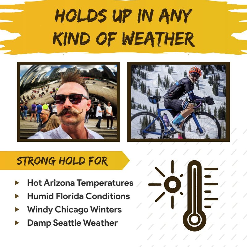 - Extra Strong Hold - Holds those unruly stash whiskers in place for 8 plus hours even in hot weather
