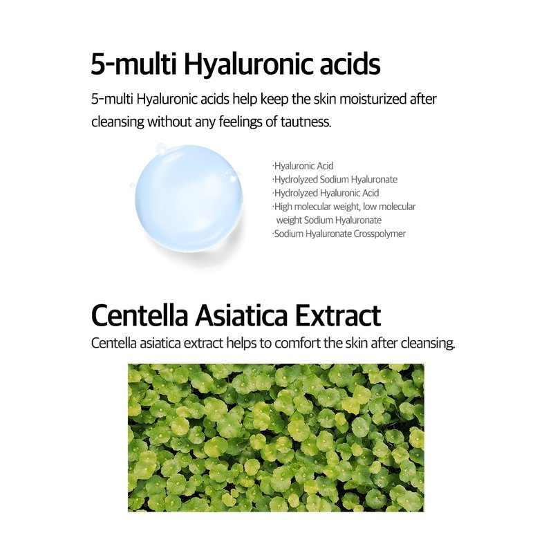- REFRESHED, SOOTHING FEELING AFTER CLEANSING WITHOUT FEELING STRIPPED: 5-multi hyaluronic acids & Centella Asiatica extract for skin moisturizing & soothing effects on the skin