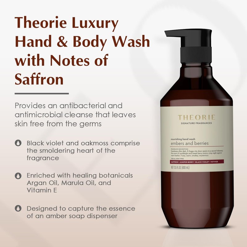 Theorie Embers and Berries Hand and Body Wash - Signature Fragrances Collection - Vegan, Luxury Soap with Notes of Saffron, Juniper Berry, Black Violet & Vetiver, Pump Bottle 400mL