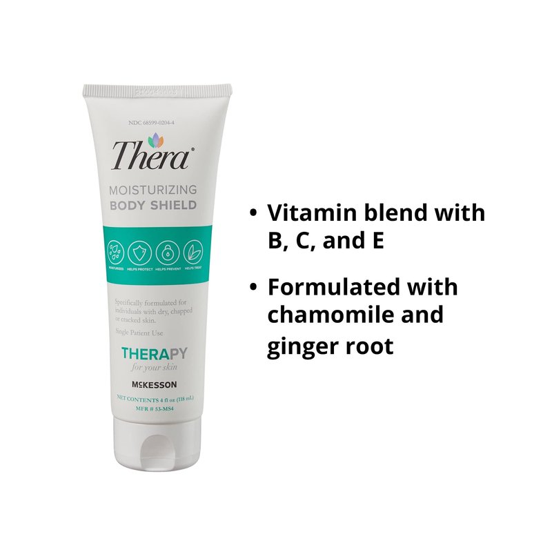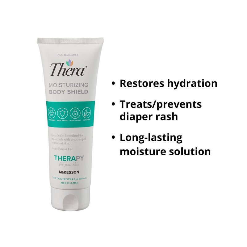 Healthy skin begins with better skin integrity. Thera Advanced Skin Care products are designed to help build that integrity through an all-in-one proprietary blend of nourishing vitamins and ingredients, helping you address a range of skin issues. Thera's moisturizing body shield helps provide an effective, long-lasting moisture barrier while relieving dry, abraded, or denuded skin. This cream is helpful in the treatment of incontinence episodes or diaper rash caused by wetness, urine and/or stool. The skin protectant blend is a mixture of silicon-based organic polymers to protect and soothe skin. This cream's composition also includes bisabolol (commonly known as chamomile) and ginger root extract. Its 1.5% dimethicone formulation helps stop water evaporation by sealing in moisture and creating a more favorable environment for healthy skin. Suitable for all parts of the body, the cream is especially ideal for heels, legs, elbows, and other areas that might need softening or added protection. Specially formulated for use in both clinical and home care settings, Thera provides lasting hydration and soothes minor irritations for sensitive and compromised skin. Thera's skincare products incorporate the healing power of nature and science. Made in the USA.