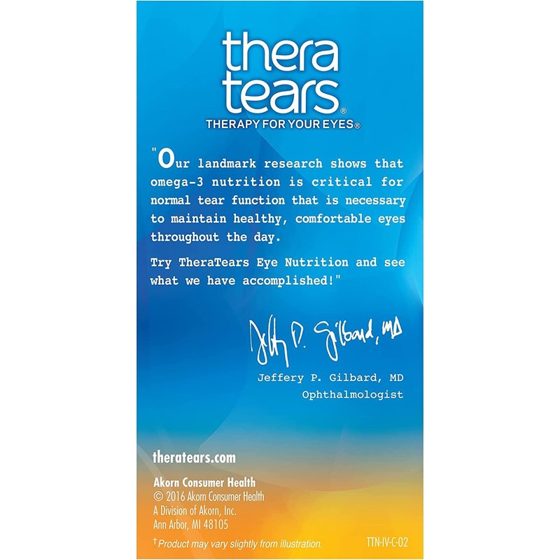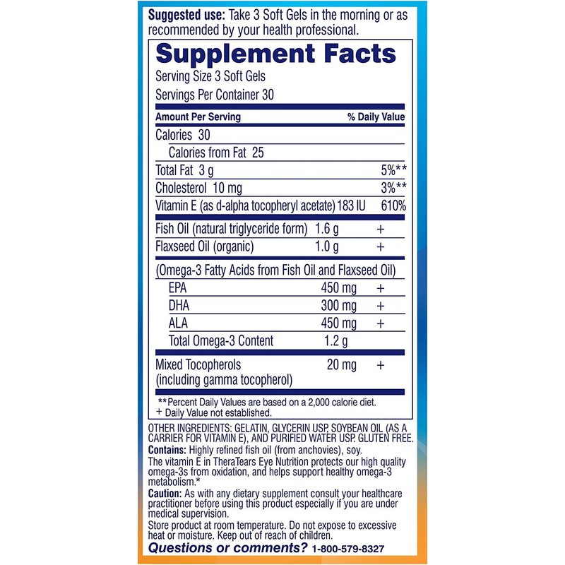 TheraTears Eye Nutrition Omega-3 Supplement nourishes eyes to promote healthy tears. The advanced formula is designed to support tear production for greater eye lubrication, help maintain tear film integrity and promote overall eye health. It utilizes an optimized blend of triglyceride fish oil and organic flaxseed oil with vitamin E. The Omega 3 fish oil used comes from organically grown, cold-pressed flaxseed oil and premium, molecularly distilled fish oil.
