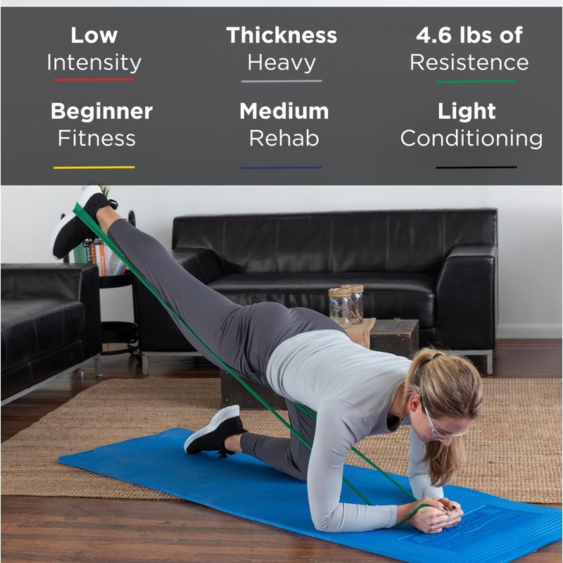 - Each band measures 5 feet long x 4 inches wide and comes in three color-coded resistance levels: Yellow-3-4.3 lbs.; Red-3.7-5.5 lbs.; Green-4.6-6.7 lbs.