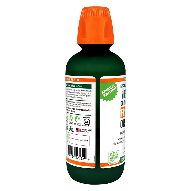 - TheraBreath mouthwash does not contain alcohol nlike most mouthwashes do. No alcohol means no burn sensation.