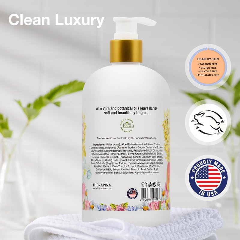 - Lather, Rinse, Renew – Place your hands in the caring embrace of THERAPINA soap. This aloe-infused, moisturizing hand soap liquid hydrates as it washes for squeaky clean, cashmere-soft skin.