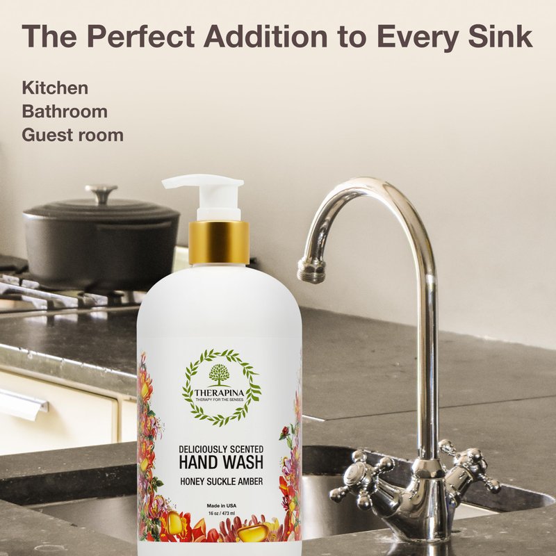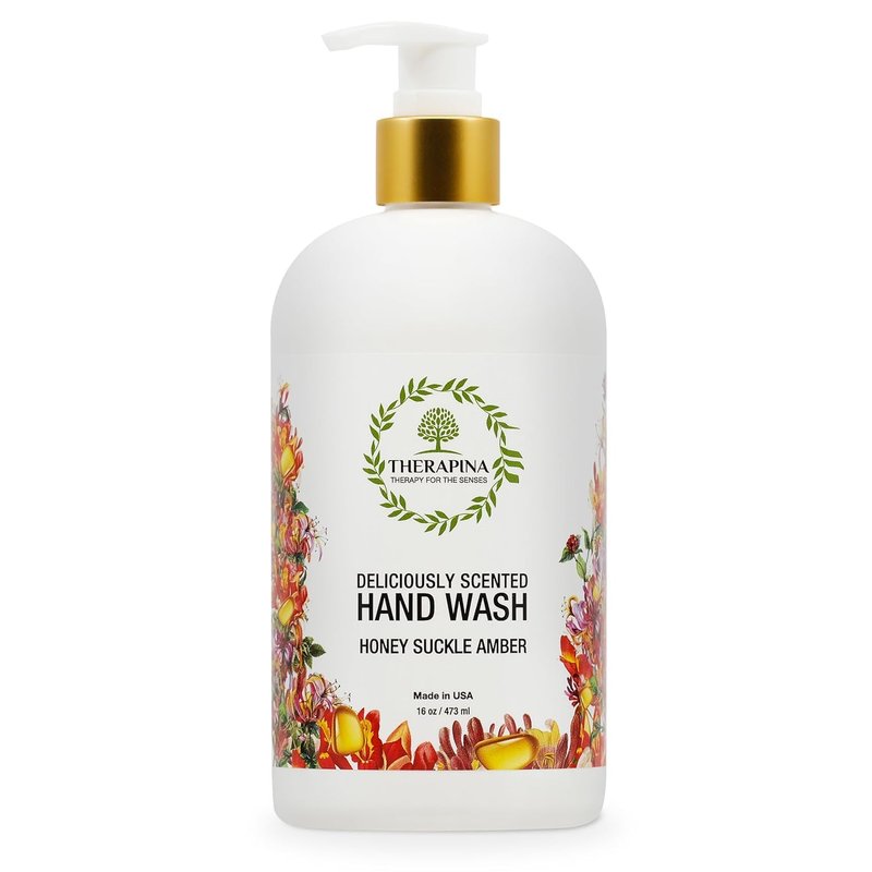 THERAPINA Aromatherapy Luxury Liquid Hand Soap – Vegan, Moisturizing Hand Wash with Aloe Vera, Botanical Oils, Honeysuckle Amber Scent – Fancy Liquid Hand Soap for Bathrooms, Kitchen, More, 16 Oz.