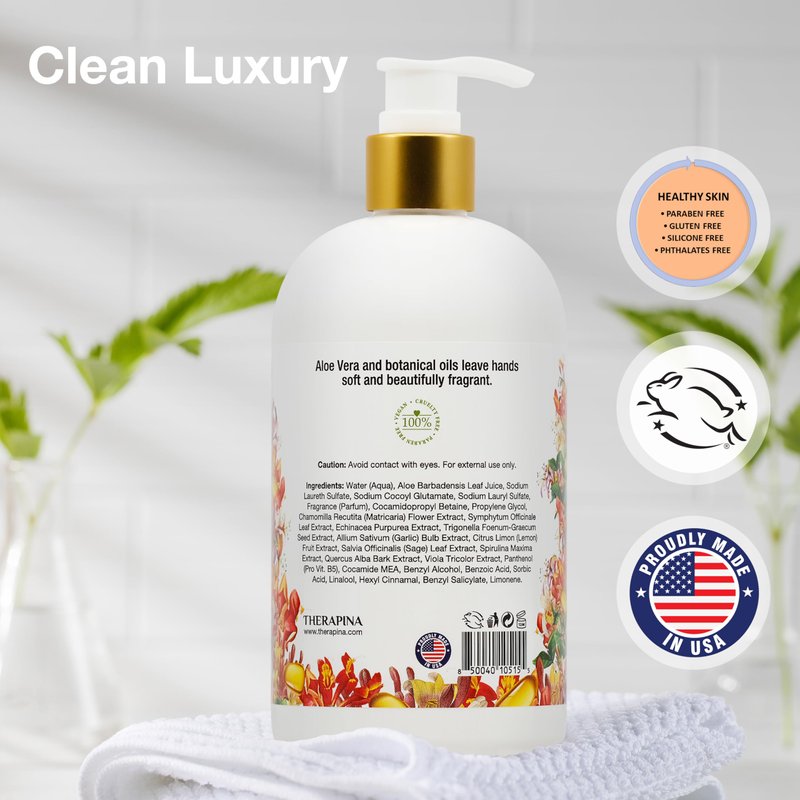 - Lather, Rinse, Renew – Place your hands in the caring embrace of THERAPINA soap. This aloe-infused, moisturizing hand soap liquid hydrates as it washes for squeaky clean, cashmere-soft skin.