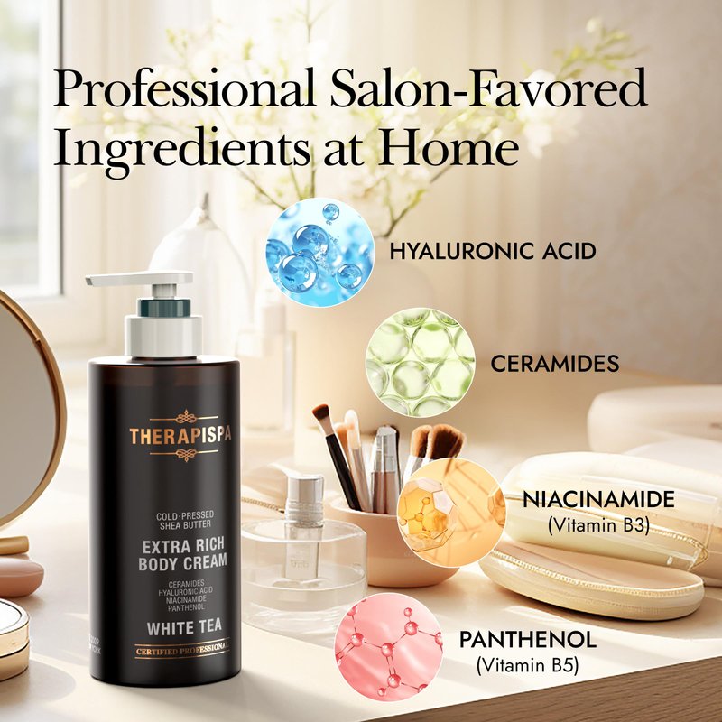 THERAPISPA Extra Rich Body Cream with Hyaluronic Acid, Niacinamide (B3), Panthenol (B5), Ceramides & Shea Butter, Nourish, Moisturize, Repair Dry Skin (White Tea, 17.0 fl oz, Pack of 1)