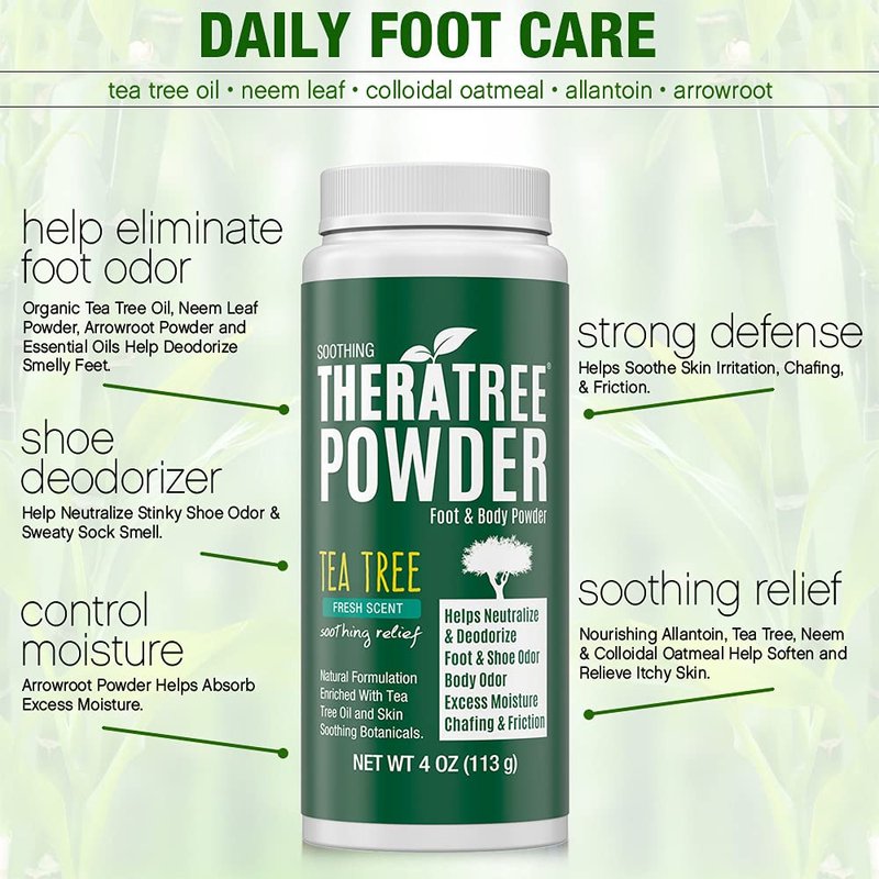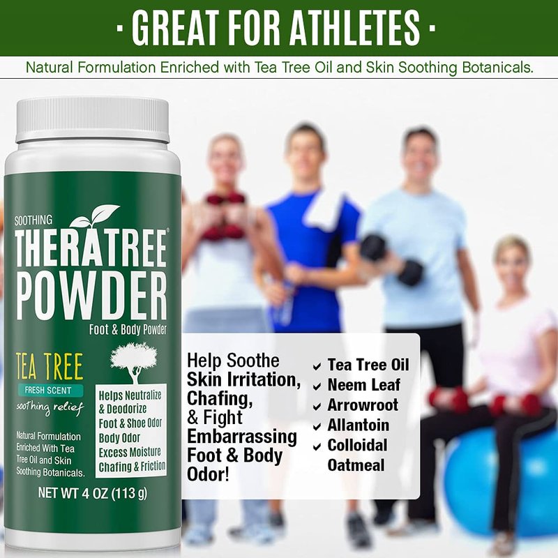 TheraTree Foot and Body powder triple action formula helps to control excessive moisture and odor, while providing soothing relief. Great for Athletes and Active individuals for both odor control, and helping prevent chafing and irritation. No added scent or menthol, just a fresh natural scent so you can be confident going about your daily routine. Triple Action Support: Moisture Control - Organic Arrowroot Powder and Kaolin Clay help control excessive moisture. Odor Control - Zinc Oxide, our blend of essential oils including Tea Tree oil, and other premium natural deodorant ingredients help keep odor at bay. Great for feet, toes, body, and private areas. Soothing Relief - Botanical ingredients like Colloidal Oatmeal and Allantoin help provide relief to irritated skin and chafing.