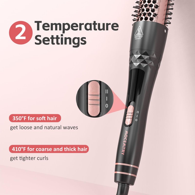 - 💝【2 Temperature Settings】Our universal voltage heated round brush with multiple temperature settings, allowing better control during styling to achieve optimal results while minimizing heat damage; 350℉for thin or soft hair; 410℉ for thick or coarse hair; The curling time can be extended depending on the hair type, the coarser and harder the hair the longer the curling iron brush should be left in the hair