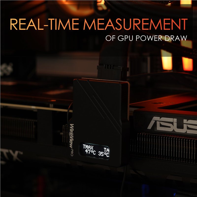 # WireView Pro GPU - Power Measurement Device for Graphics Cards The WireView Pro GPU is an advanced device for measuring and monitoring power consumption of graphics cards. Developed in collaboration with Jon "elmor" Sandström, it connects to the graphics card's 12VHPWR power connector and displays power consumption data on an OLED screen. ## Key Features: - OLED display for real-time data - Power consumption measurement and recording - Internal temperature sensors at power connectors - External temperature sensors (2 included) - Pin detection for sensor-pin connectors - Alarm function for temperature or current limit exceedance - Optimized cable management ## Advanced Functions: - Detection of 150W, 300W, 450W, or 600W cables - 60-second measurement cycle for quick consumption analysis - Power spike detection ## Technical Details: - Available in "Normal" (N) and "Reverse" (R) versions - Supports up to 450 watts of power (e.g., for GeForce RTX 4090) - Measures consumption through power connector only, not PCIe slot ## Safety Notice: Due to high power throughput, the device can heat up significantly during operation. Allow it to cool down after shutting off before handling. The WireView Pro GPU is the ideal tool for enthusiasts, reviewers, and anyone looking to precisely monitor their high-end graphics card power consumption.