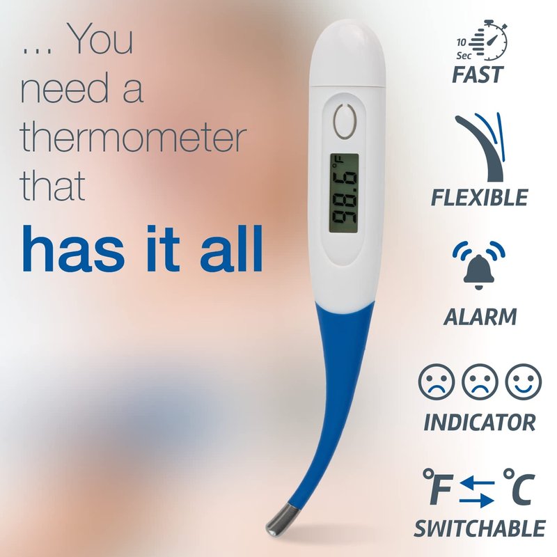 - Smooth flexible probe tip for comfort, LCD display, easy to read and waterproof