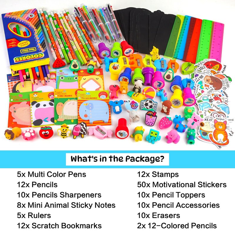 - 168PCS Goodie Bags Stuffers for Kids - This stationery party favors kit includes 5 multi color ballpoint pens, 12 pencils, 10 pencils sharpeners, 8 mini animal sticky notes, 5 rulers, 12 scratch bookmarks, 12 stamps, 50 motivational stickers, 10 pencil toppers, 10 pencil accessories, 10 erasers, 2 pack 12-colored pencils.