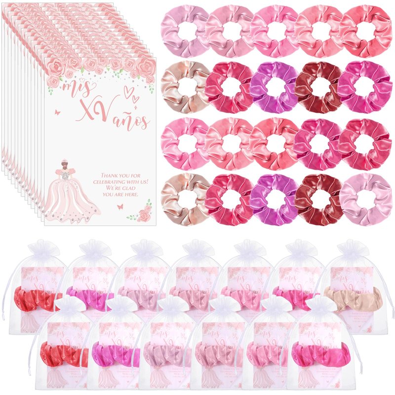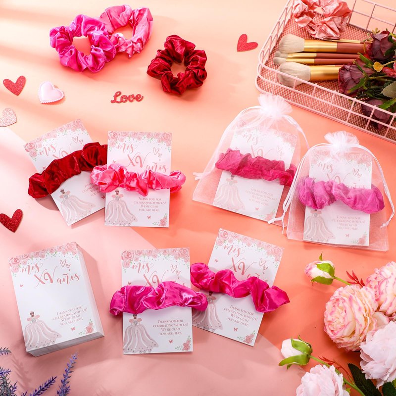 Features: These versatile scrunchies of the party favors for quinceanera can be applied not only as hair accessories but also as wrist adornments, adding a touch of color to any outfit. They make for the ideal accessories for the quinceanera or any other related occasions. The scrunchies are stretchy and elastic, providing a firm grip around the hair. Our package not only provides quinceanera party favors but also enhances the excitement of your celebration. Suitable for various quinceanera related events, these satin scrunchies with thank you cards and organza bags can enhance the mood of any gathering. Specifications: Material: Pink scrunchies: satinThank you card: 300 g coated paperColor: Pink scrunchies: 10 pink themed colorsSize: Pink scrunchies: about 1.4 inches/ 3.5 cm in unexpanded inner diameterThank you card: about 3.15 x 4.72 inches/ 8 x 12 cmOrganza bags: about 5.12 x 7.09 inches/ 13 x 18 cmPackage includes: 50 x Pink scrunchies50 x Thank you card50 x Organza bagsNotes: Manual measurement, please allow slight errors on size. The color may exist a slight difference due to different screen displays.