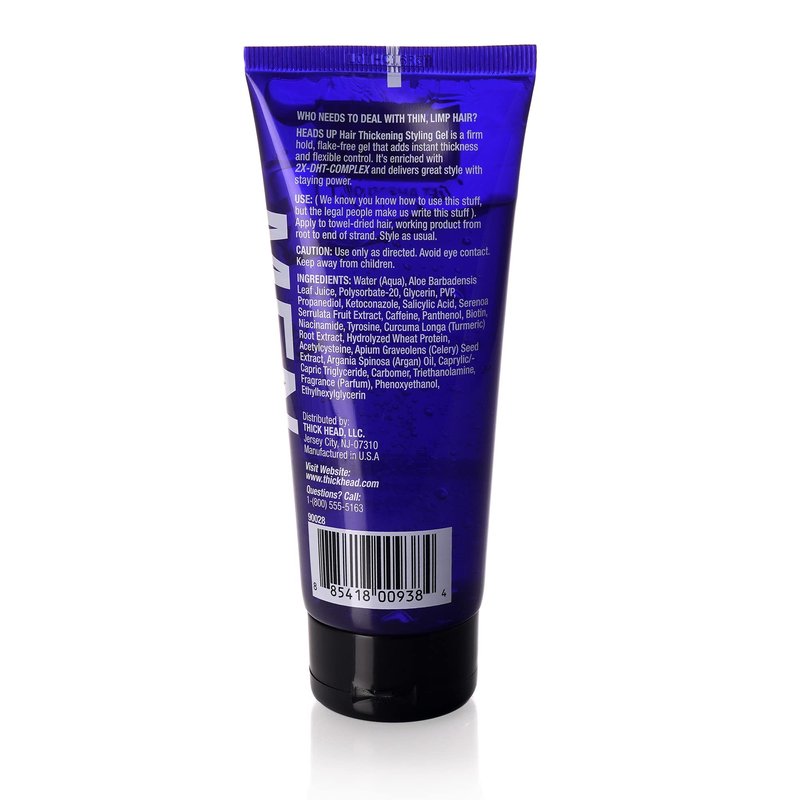 Thick Head HEAD'S UP Hair Thickening Styling Gel is a sulfate, paraben and dye free styling gel created for men experiencing thinning hair or hair loss. If hair is thinning, Dihydrotestosterone, or DHT, is the likely culprit. DHT, a hormone that causes hair follicles to shrink, can result in the slowing or stopping of hair growth, and is the principle cause of Male Pattern Baldness.