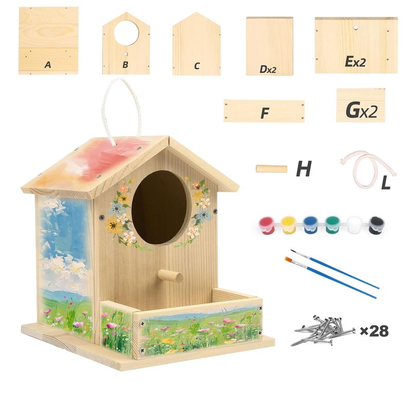 - BUILDING & PAINTING KIT: Our bird bungalow craft kit includes 10 wood pieces with pre-drilled holes, 1 perch post, 1 hanging rope, 28 screws, 6 colors of paint, 2 brushes, 1 easy-to-follow instruction guide; Phillips screwdriver needed for assembly (not included)