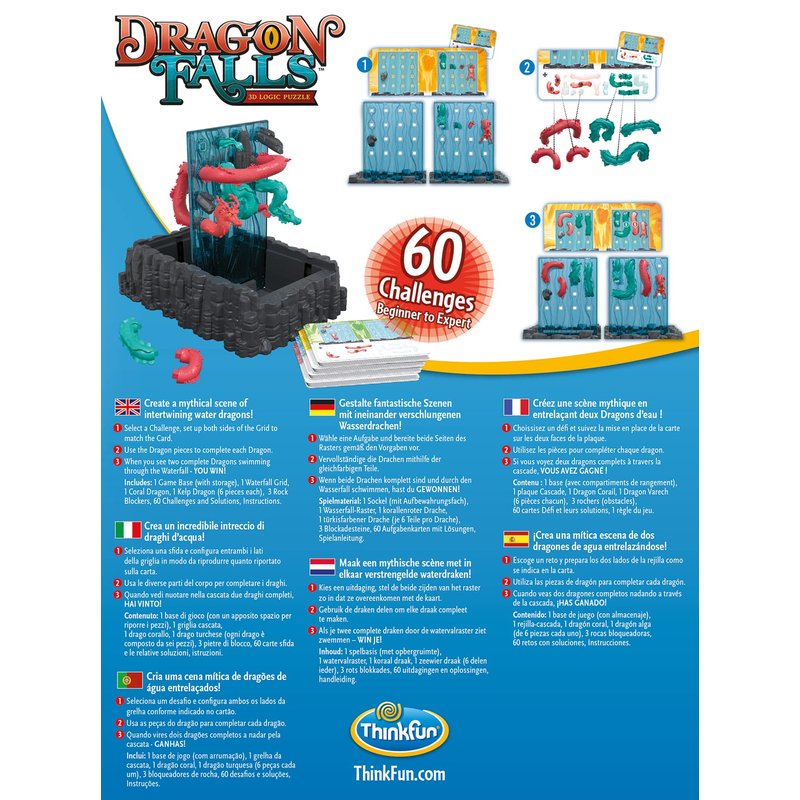 - What you get – Dragon Falls is a combination logic game and creative building toy that's one of the best gifts you can buy for boys and girls age 8 and up It contains 60 challenges from beginner to expert, a game grid, 2 six-piece dragons, , 3 blockers, and a game grid base that doubles as storage