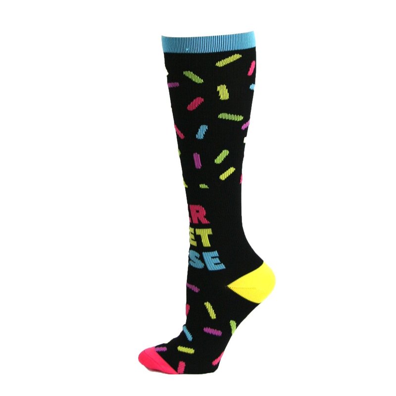 SUPER SWEET NURSE > printed across the sock. These colorful compression socks provide excellent support for you at work! They feature gradient compression that delivers controlled pressure from ankle to calf in order to promote better blood flow throughout the lower leg. Wear them daily for lower leg support and enjoy the comfort of a non-restrictive band and built in arch support. 10-14mmHg gradient compression 90% nylon, 8% elastic, 2% spandex Energize tired legs Reduce muscle strain and Relieve varicose vein discomfort Prevent swelling Non-Restrictive comfort top Built-in arch support Machine wash warm with like colors. Do not bleach. Tumble dry. These are Regular size womens sock size 9-11. (Woman's U.S. shoe size ranging from 5-10) Compression socks are designed to be tight, however if you have larger calf's these may not fit.