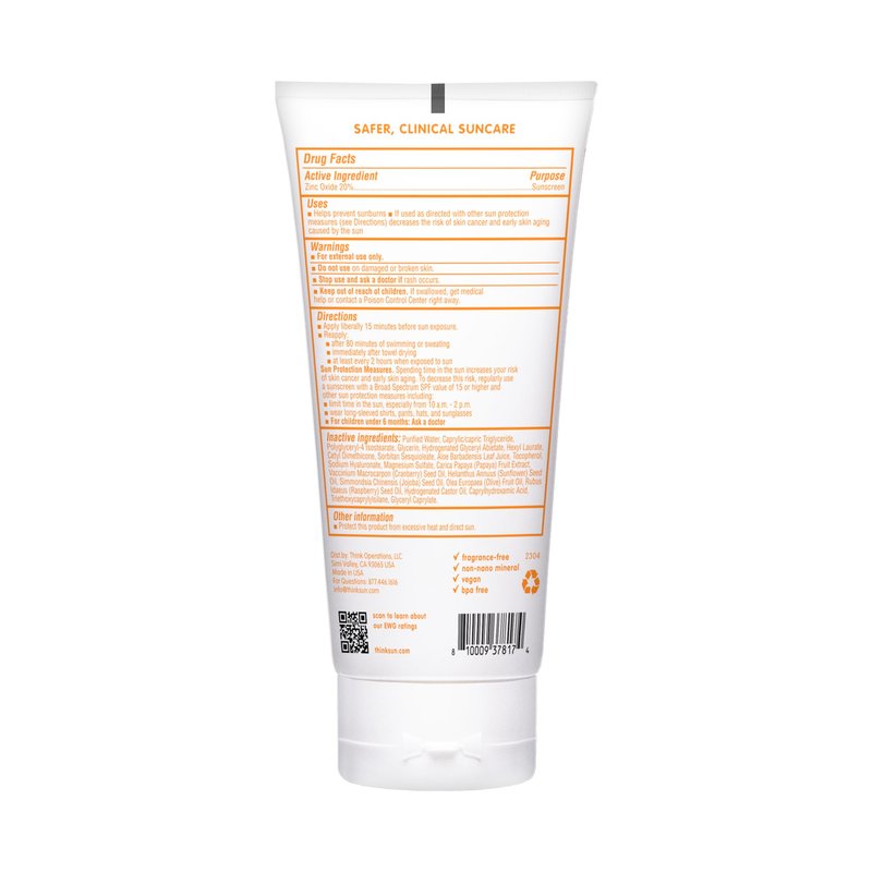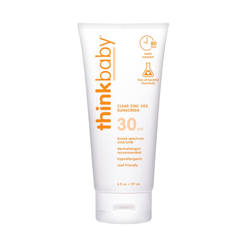 THINKBABY SPF 30 CLEAR ZINC SUNSCREEN: This safe and gentle baby sunscreen offers effective and reliable broad-spectrum UVA and UVB protection for complete peace of mind. Pediatric dermatologists recommend SPF 30 sunscreen for babies to shield delicate skin from harmful rays. The mineral-based sun lotion's active ingredient is Zinc Oxide, and goes on white so you can see where you are applying it before it dries clear. The fast-absorbing baby sunscreen isn't greasy or sticky and is enriched with cooling Aloe and conditioning Vitamin E to infuse your little one's skin with soothing moisture. CLEAN & NATURAL: Thinkbaby sun cream is free of biologically harmful chemicals. The sun lotion contains no PABA, parabens, phthalates, BPA, oxybenzone, avobenzone, petroleum, gluten, dairy, or toxic chemicals. Leaping Bunny members. Our sun creams do not contain any chemicals known to harm coral reefs, and are supplied in a tube made of environmentally friendly packaging that does not contain BPA, vinyl, or phthalates. ACTIVE INGREDIENT: Zinc Oxide 20% (Non-nano) INACTIVE INGREDIENTS: purified water, caprylic/capric triglyceride, polyglyceryl-4 isostearate, glycerin, hydrogenated glyceryl abietate, hexyl laurate, cetyl dimethicone, sorbitan sesquioleate, Aloe barbadensis leaf juice, tocopherol, sodium hyaluronate, magnesium sulfate, carica papaya (papaya) fruit extract, vaccinium macrocarpon (cranberry) seed oil, helianthus annuus (sunflower) seed oil, simmondsia chinensis (jojoba) seed oil, olea europaea (olive) fruit oil, rubus idaeus (raspberry) seed oil, hydrogenated castor oil, caprylhydroxamic acid, triethoxycaprylylsilane, glyceryl caprylate.