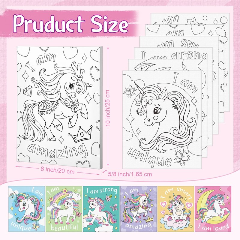 - Canvas Painting Kit: you will receive 6 pieces of unicorn pre-drawn canvas in different unicorn patterns, with back stapled to a 5/8inch wide wooden frame; Allows you to draw with your preferences or our picture colors and share with your friends