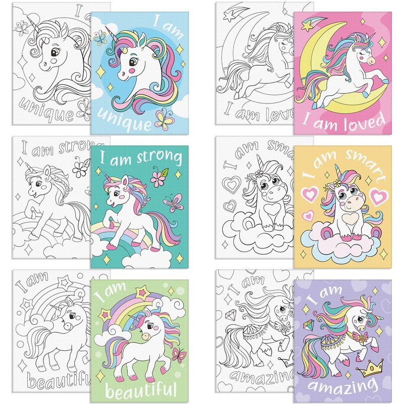 Thinkday 6 Pieces Pre Drawn Canvas for Painting 8 x 10 Inch Pre Drawn Stretched Canvas Positive Affirmations Back to School Paint Kit for Kids Classroom Paint Activity Party Favors(Unicorn)