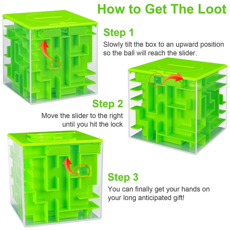 - How to Get the Money Maze Loot : 1. Slowly tilt the box and make the ball in the slide bar or that little latch on top. 2. Once the ball is positioned, push the slide bar across to open the money puzzle box. 3. Open the circular lid to the money bank. 4. Insert your reward and close the lid. Finally you can get your long anticipated gift. Just have a little logic and patience, you can always make it!