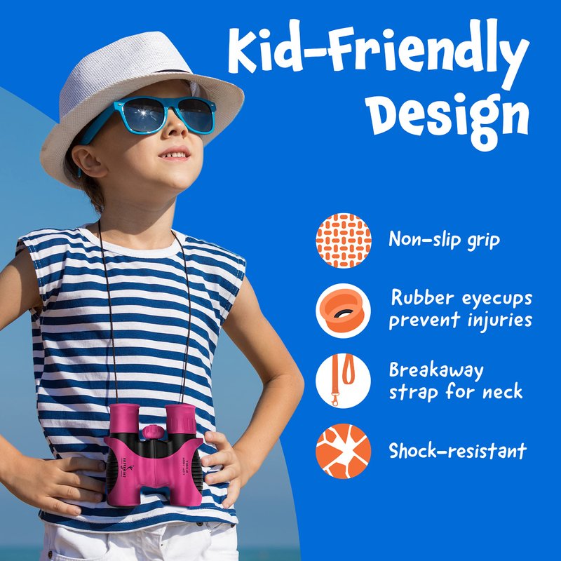 While other toy binoculars for kids don’t focus or function like real binoculars, our mini binoculars offer high-powered 8x21 magnification with BAK-4 roof prisms for sharpness. Intuitive & easy to use, our binoculars also feature a grip ergonomically designed for kids.