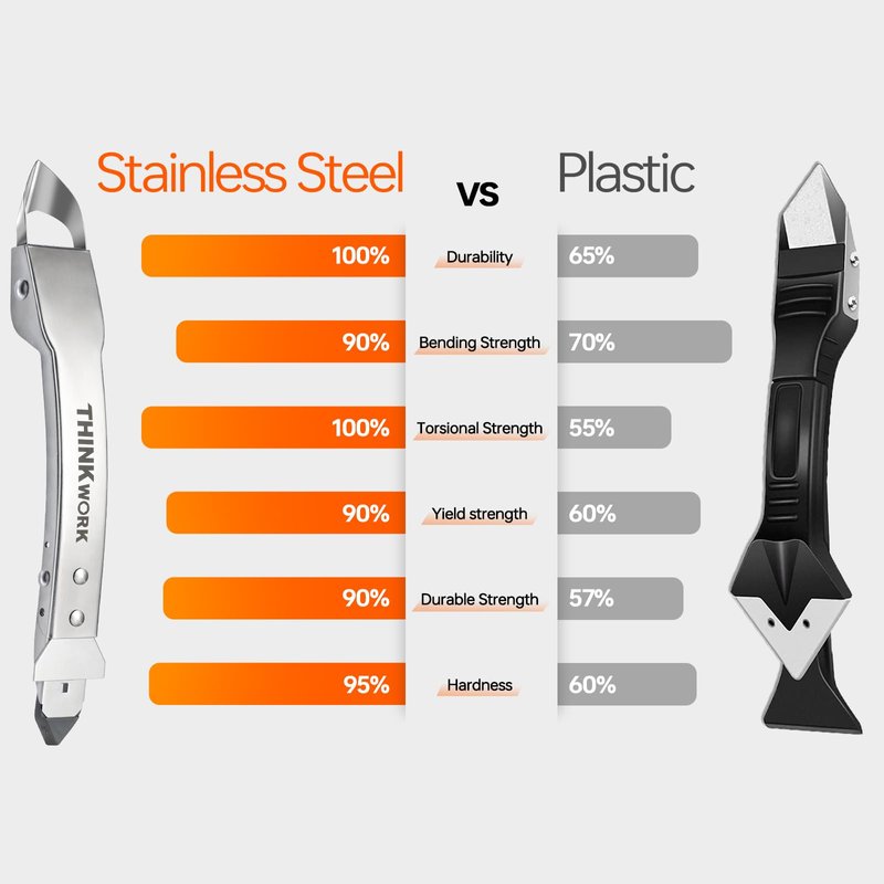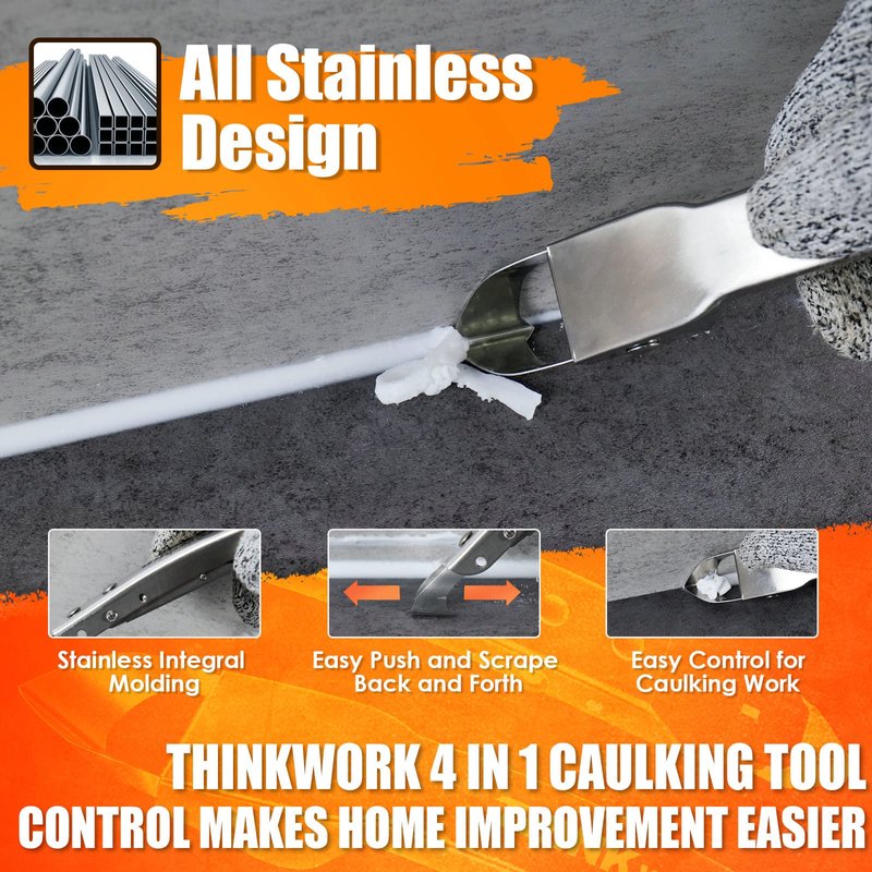 - New design and upgraded : This stainless steel caulking tool is designed as a 4-in-1 tool, made entirely of stainless steel which is highly durable. It also has a newly upgraded stainless steel handle that is less prone to breaking.