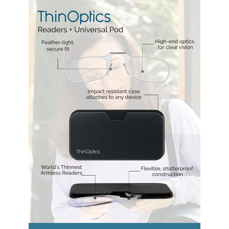 - ULTIMATE PORTABILITY & ACCESSIBILITY: Say goodbye to the frustration of misplaced reading glasses. With our ThinOptics readers, which feature the world’s thinnest armless readers with our portable slim case, you have a versatile vision solution that travels anywhere. The easy-to-carry compact case attaches to your cell phone or tablet, or fits in your pocket, wallet or purse for vision assistance that goes wherever you do.