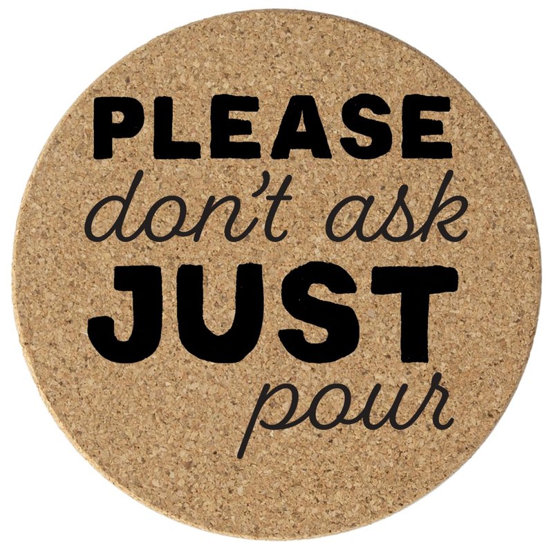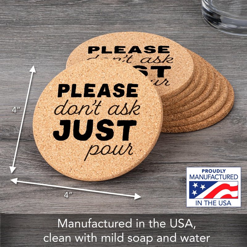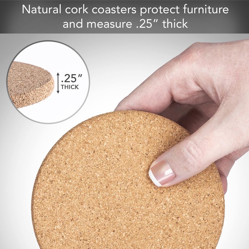 Thirstystone Just Pour 8-Pack Thick Cork Coasters. Cork is a natural material that is harvested from the bark of cork trees without harming the tree itself. Cork is a sustainable and ecofriendly choice. Cork coasters help to protect surfaces from heat, moisture, and scratches. Cork is durable and can withstand daily use. Cork is naturally absorbent to absorb moisture from beverages and prevent surfaces from scratches, stains, and water rings. Set of 8 coasters will arrive in this package. Each Coaster measures 4” round