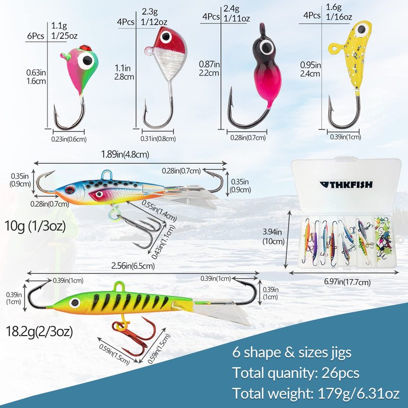 THKFISH Ice Fishing Lures Ice Fishing Jigs Ice Fishing Gear Hard Fishing Lures Ice Fishing Kit Crappie Panfish Jigs 26pcs